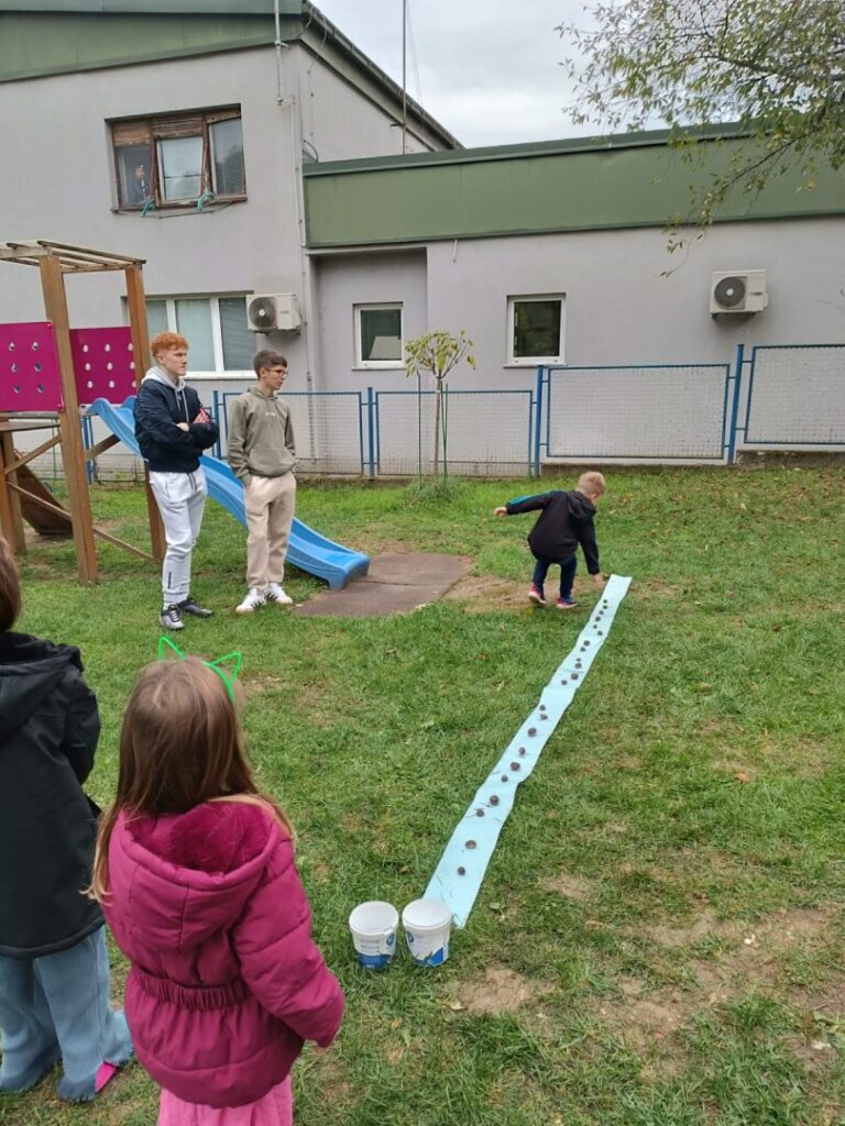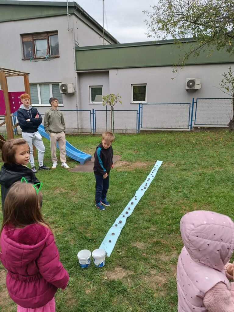 Uz pomoć srednjoškolaca, djeca su se natjecala u zabavnoj igri u kojoj je cilj bio ubaciti što više kestena u košaru jednom rukom. Stariji su pokazali primjerom i bodrili mlađe, stvarajući ozračje suradnje i zajedničkog uspjeha.