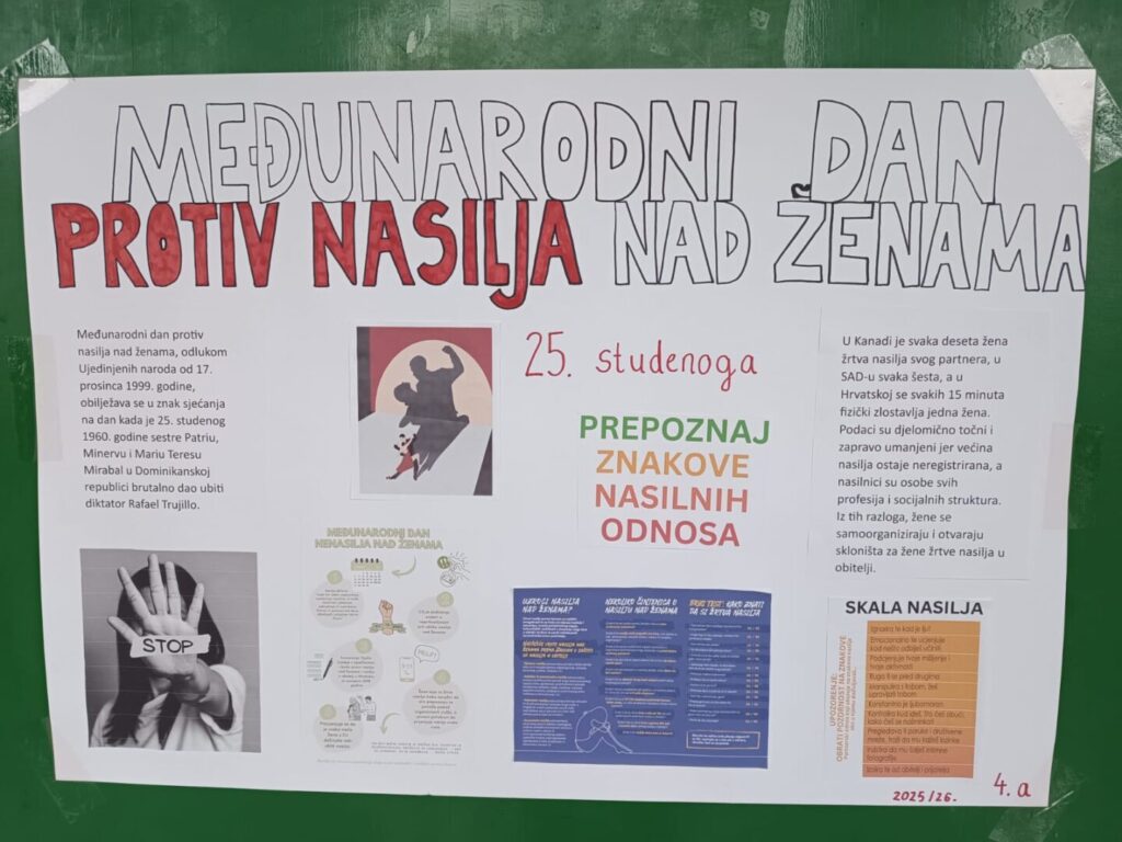Posebno pohvaljujemo učenike 4.a razreda, koji su izradili informativni i poticajan plakat na temu borbe protiv nasilja nad ženama. Plakat je izložen u školskom hodniku i poziva na solidarnost, poštovanje i nenasilnu komunikaciju.