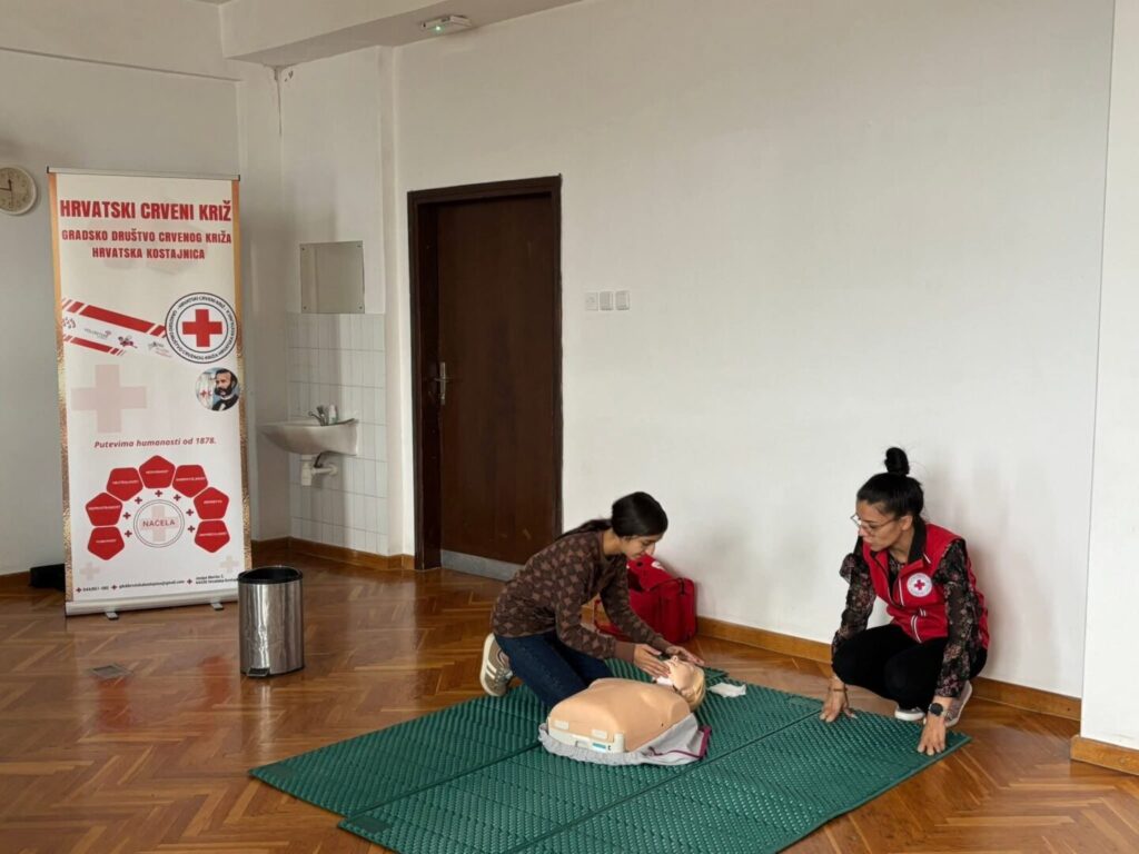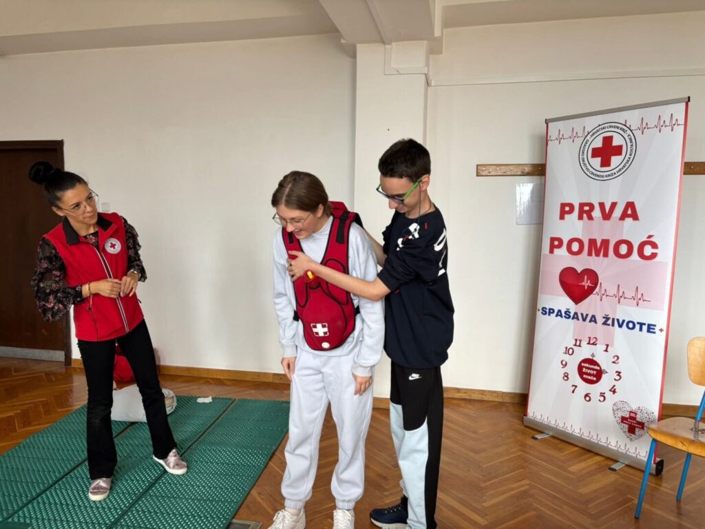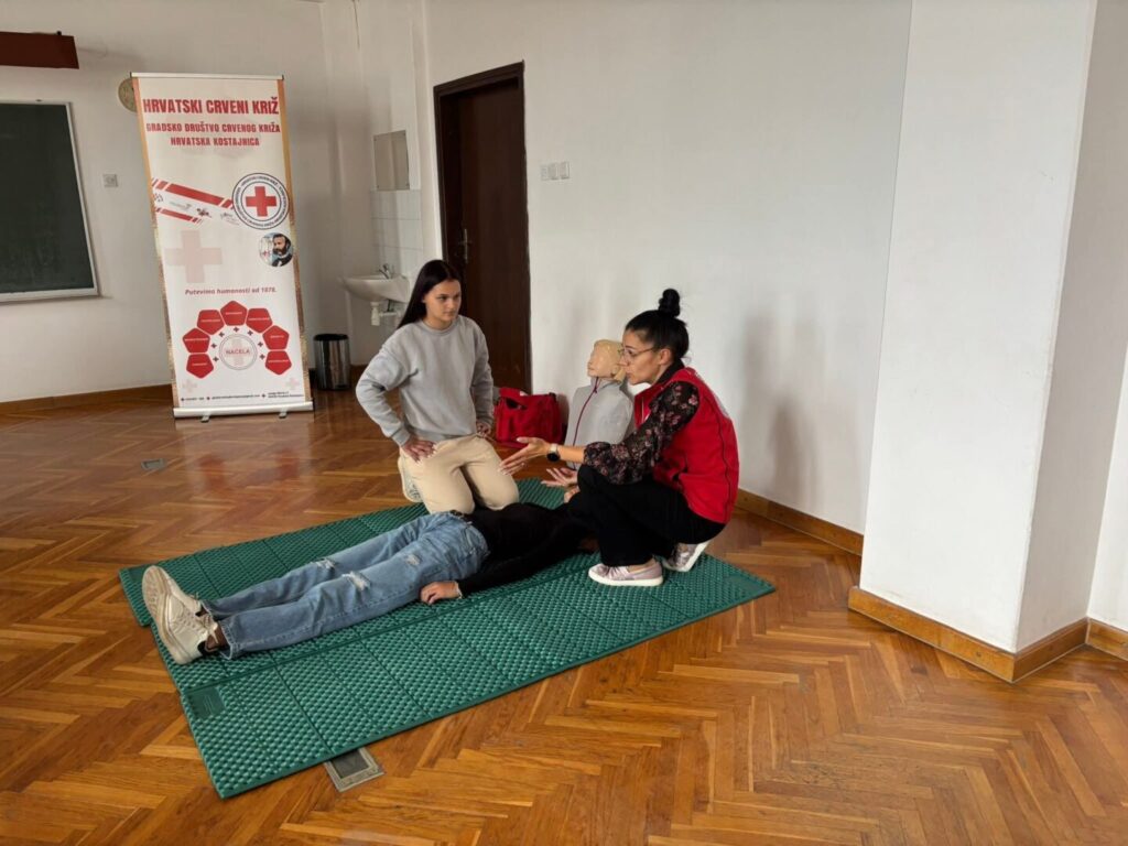 Učenici su pod stručnim vodstvom zaposlenica Gradskog društva Crvenog križa Hrvatska Kostajnica vježbali osnovne tehnike prve pomoći: bočni položaj, reanimaciju i Heimlichov zahvat.